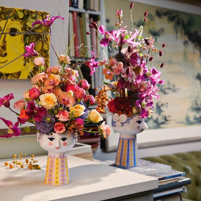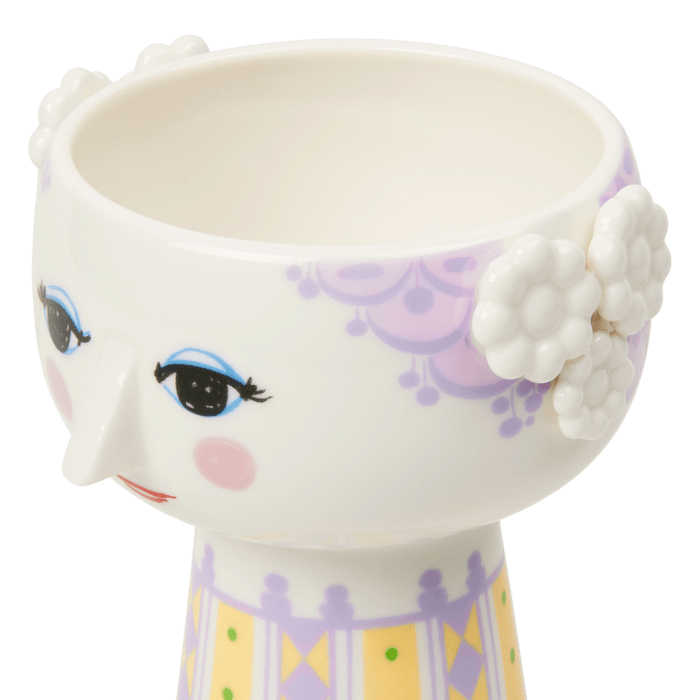 Versatile, iconic, and charming, these Eva Vases are embellished with Wiinblad's familiarly flamboyant and colorful adornments and can be used for many different interior plants such as succulents, herbs, heather and more! Fill with cut flowers to create a beautiful floral arrangement inside as well.