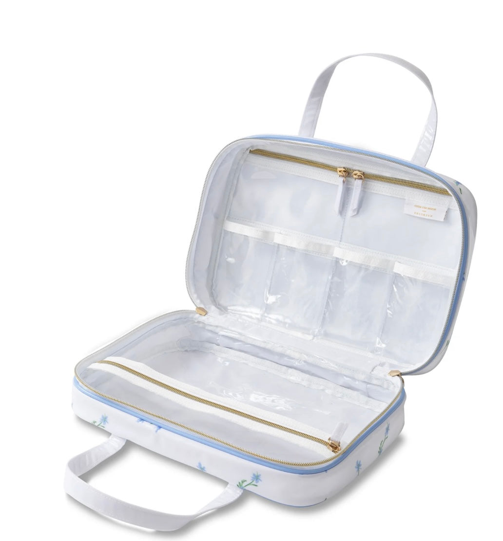 Whether you’re at home or traveling, keep your toiletries organized with this stylish cosmetic case. With a whimsical blue floral motif and a polyvinyl coating, this case is stylish, water-resistant, and easy to clean. The multiple compartments offer ample storage, including a clear zipper pouch on one side and two closed zipper compartments along with four easy-to-access open pockets. A double zip pull closure is featured on the exterior to keep everything neatly contained along with two easy-to-carry handles.
