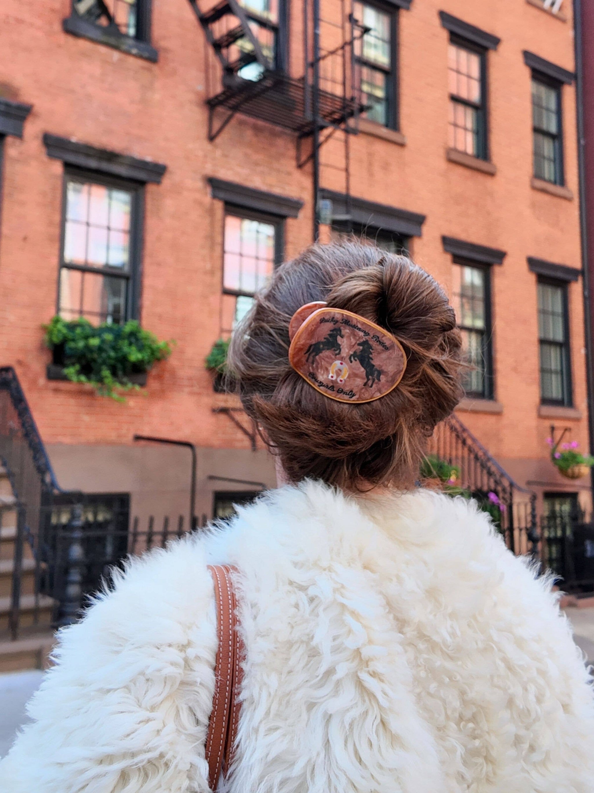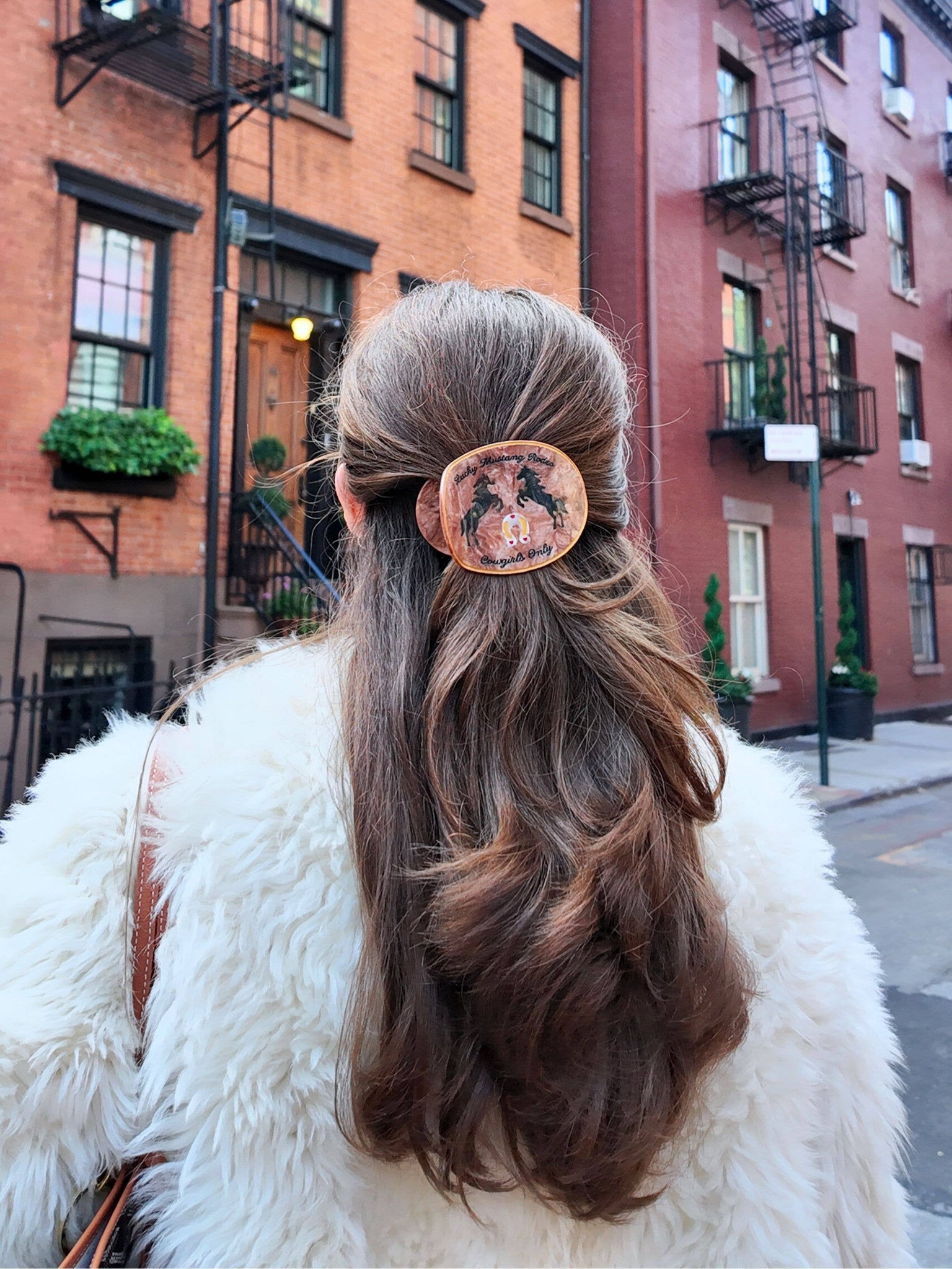 Saddle up—this one’s got kick. Hand-painted with a Lucky Mustang Rodeo emblem, this flat claw clip channels vintage rodeo posters, dusty highways, and that wild-at-heart energy. It’s a nostalgic nod to Americana with an edge—crafted for the days when your hair needs wrangling and your schedule calls for serious comfort.