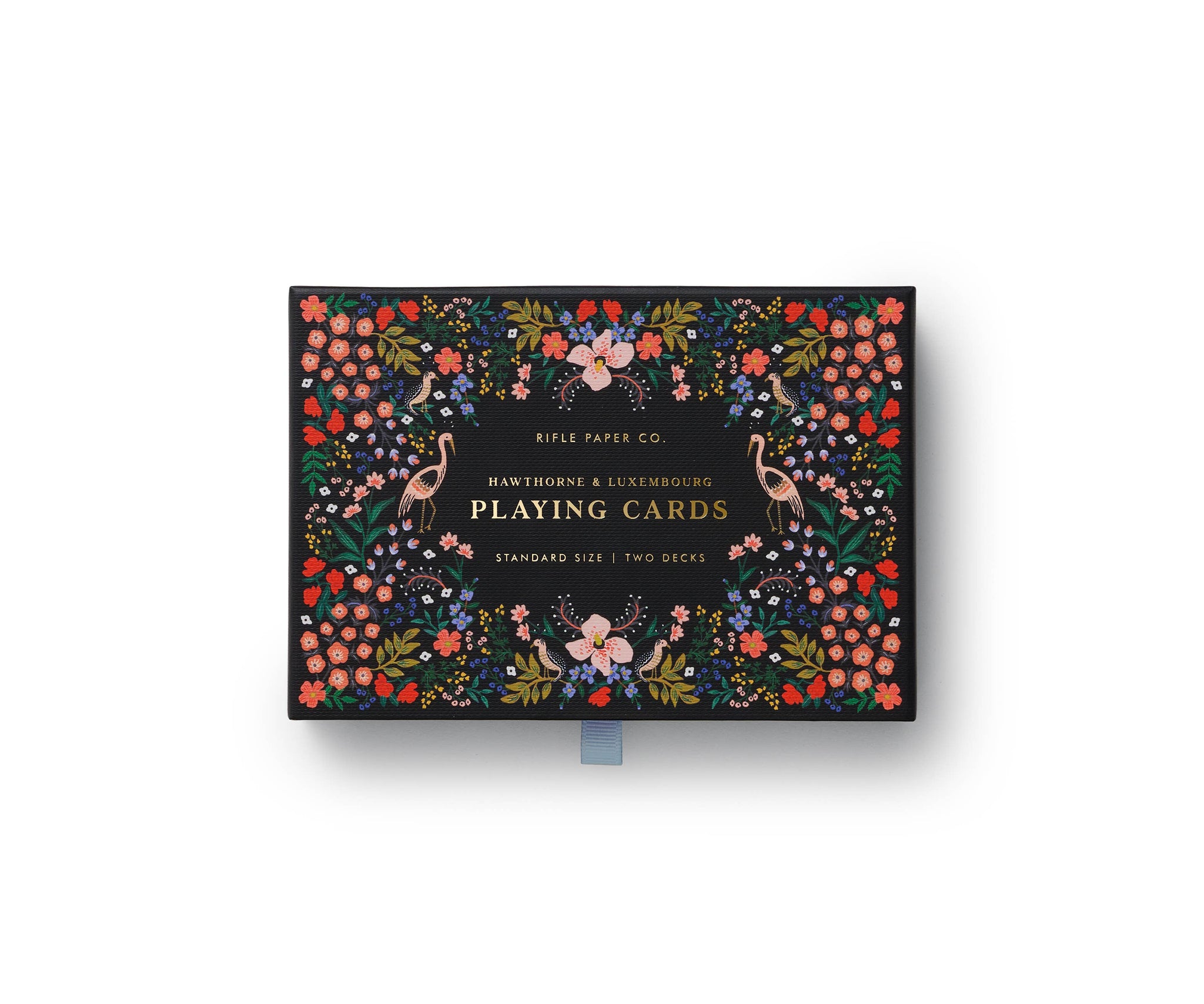 A set of two standard playing card decks in a decorative keepsake box with gold foil and a ribbon pull tab. All cards feature full-color illustrations with added decoration on all face cards and jokers. The decks include 56 standard cards, and are produced by the United States Playing Card Company.